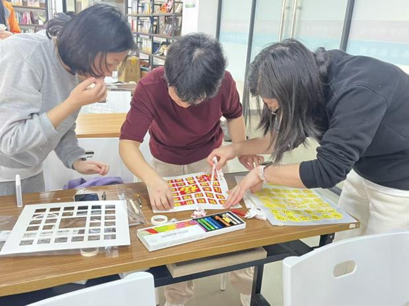 活动现场,志愿者先讲解“福”字的文化内涵与历史渊源,从楷书的端正规整到行书的舒展灵动。“百福”寓意着吉祥、幸福和美满,代表着人们对美好生活的期望。百福图,由一百种不同的“福”字样组成,它们以篆书为基底,字字异形,形态各异,展现了不同书法体的无限魅力和创造力。志愿者向企业职工们介绍了此次主要使用到的工具“超软油画棒”的特性——触感如绒,显色饱满,晕染柔和,中国东方红的颜色与福字相得益彰、质感温润丝滑。随后,企业职工们在志愿者的指导下在白色的画纸上绘制印泥似的方格,再用小铲刀把黄色的油画棒碾碎反复抹开,利用福字模版,尝试从篆书“福”的圆转笔画到楷书“福”的端方结构,逐一尝试。不同于传统书法的严谨,油画棒的肌理让每个“福”字都自带“软萌”滤镜和立体质感,最后再撒上些许金粉,营造喜庆氛围。